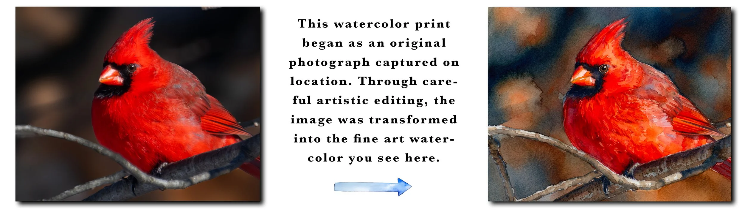 A male Cardinal perches among winter branches, his brilliant scarlet plumage providing vibrant contrast against dark bark and subdued surroundings. Captured through my lens and rendered with a watercolor finish, this print celebrates the flash of color that brightens cold season landscapes. The vivid red and stark setting create a bold composition of seasonal beauty.