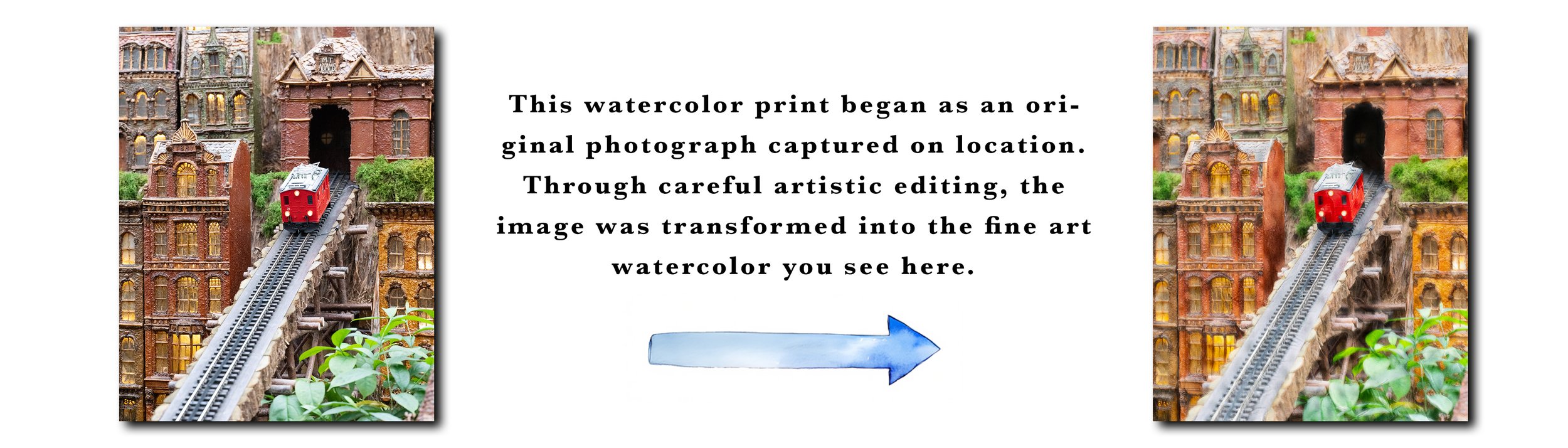 A miniature recreation of Mt. Adams' historic incline railway climbs through a detailed village scene, preserving memories of Cincinnati's beloved hillside transportation. Captured through my lens and rendered with a watercolor finish, this print celebrates the city's innovative transit history through handcrafted artistry. The ascending track and architectural details create a nostalgic composition of progress and charm.