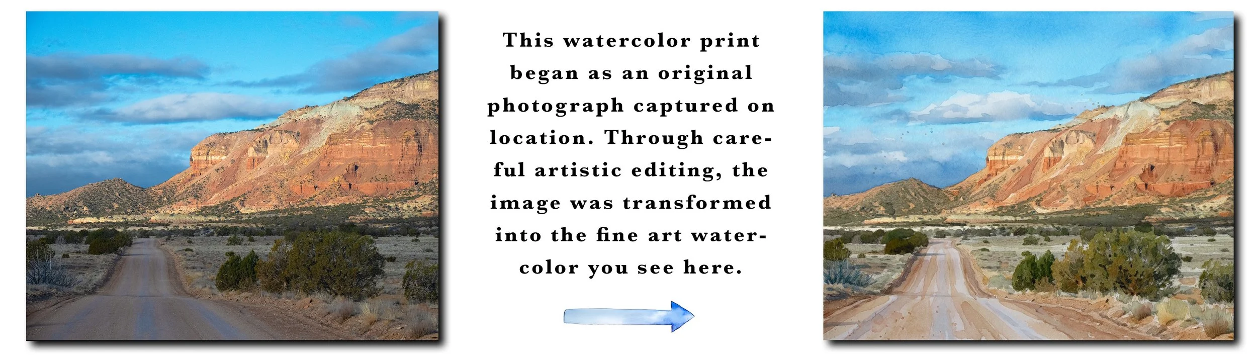A dusty dirt road beckons you forward into the heart of the American West, leading the eye toward ancient red rock cliffs that rise dramatically against a cloud-filled sky. Sage and desert scrub line the path, their muted greens contrasting beautifully with the warm ochres and burnt siennas of the canyon walls. Captured through my lens and rendered with a watercolor finish, this print brings the wide-open freedom of Utah's canyon country into your home.